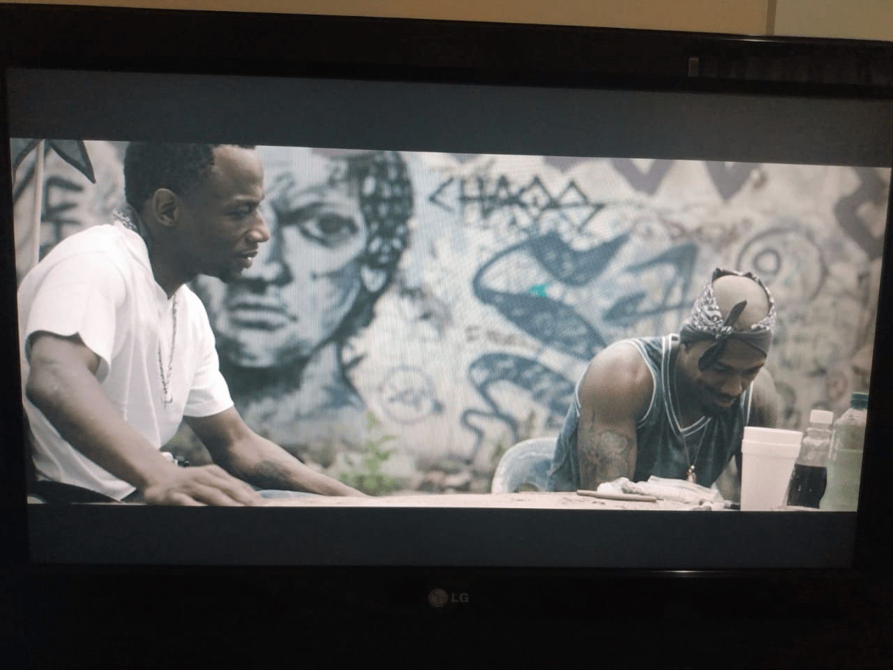 Em um ambiente fechado, um sentimento que sufoca e pede para sair e inundar a comunidade. Na montagem, corta do caixão de Patty para Chi-Raq (01 a 03 nas fotos abaixo), segue cortando da última frase do membro de camiseta branca, sugerindo uma postura diferente diante dos protestos e da violência que aquele grupo e suas ações geram + reação (insatisfeita) de Chi-Raq para um grafite em um muro/outdoor com um dedo “do meio” segurando ou parando uma bala (04 e 05). Depois abre o plano e é uma mensagem de not bullets ou sem balas. Através da montagem, saímos de uma reação negativa (Chi-Raq quer seguir a vida na criminalidade), simbolizada pela junção de planos, para, através de outro plano, voltarmos a mensagem principal do filme (06).